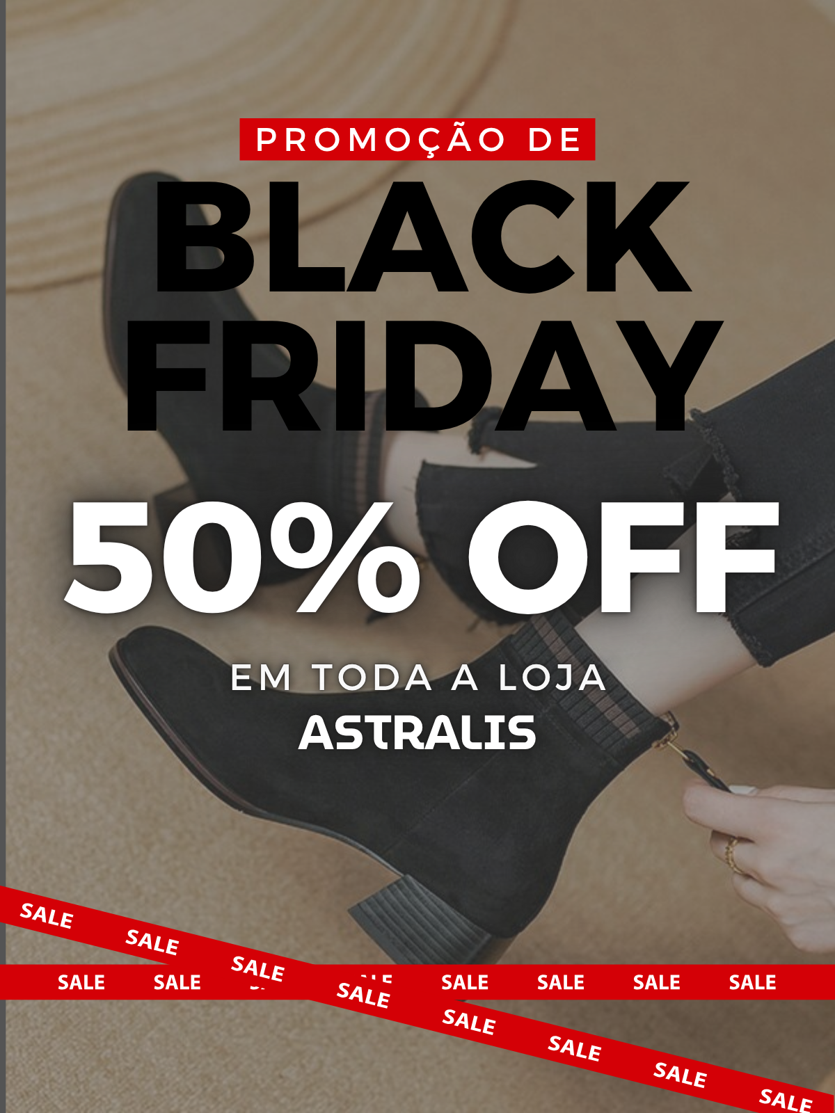 A nossa Black Friday oferece 50% OFF em TODO o site! Sim, o desconto de 50% é válido para todos os modelos de botas e calçados femininos, incluindo lançamentos e coleções atuais.